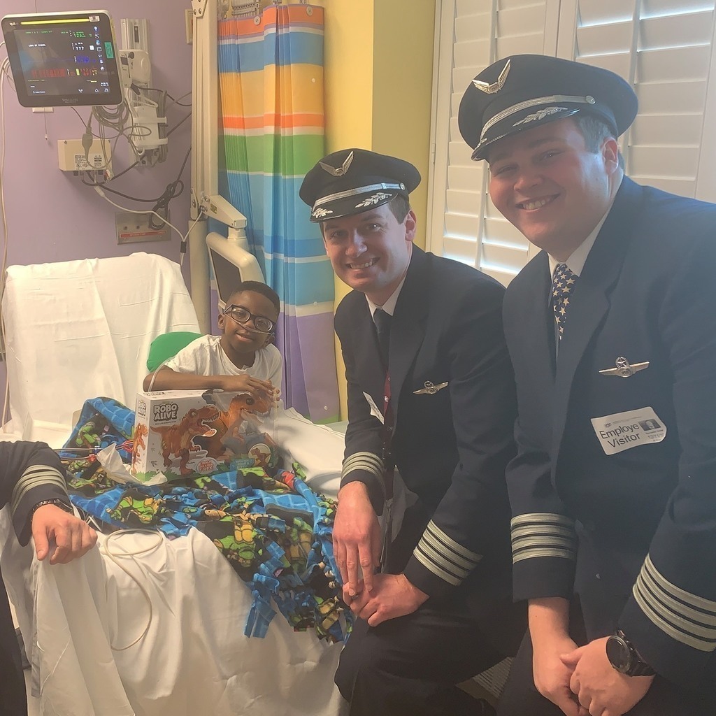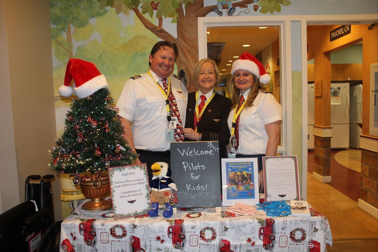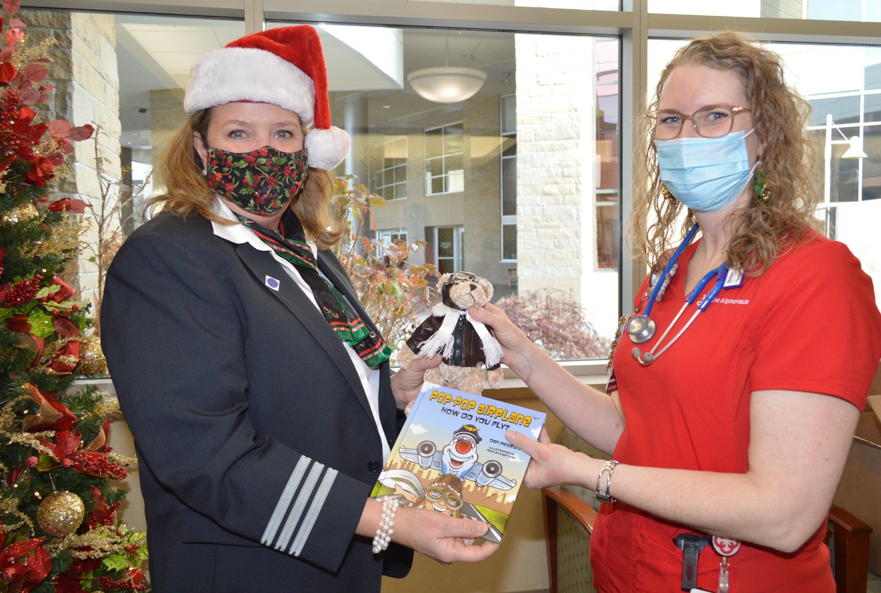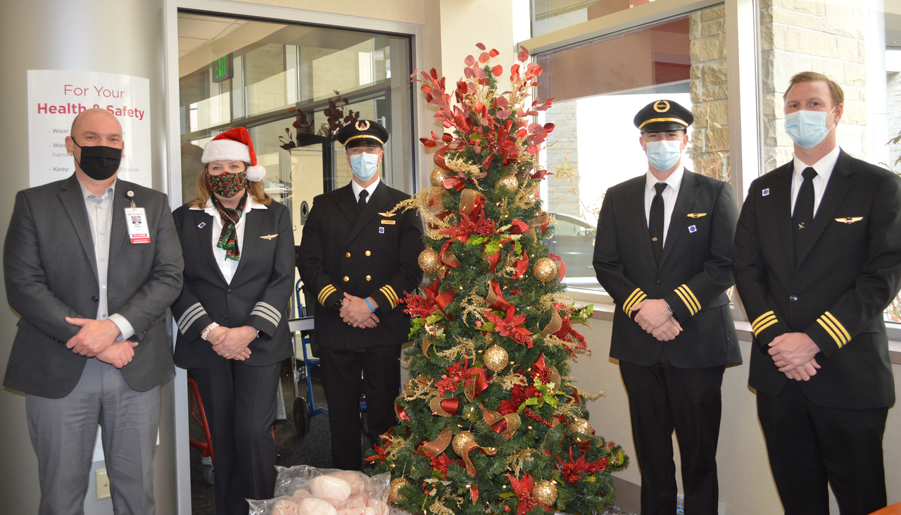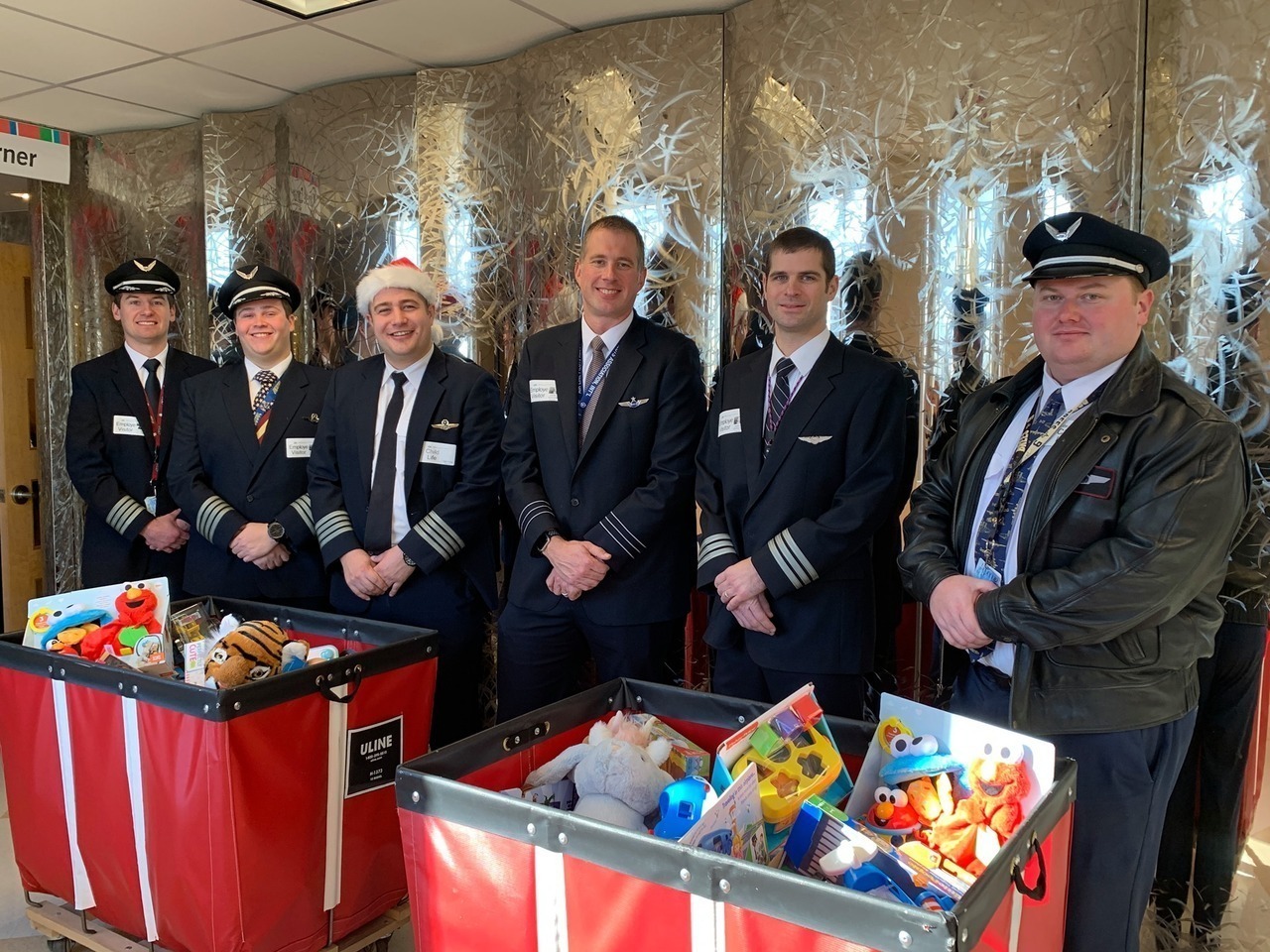 Description: Pilots from Sioux Falls Pilots for Kids visited Sanford and Avera McKennan Children's hospitals to hand out toys and share some Christmas cheer with kids and their families. Paul Dokken (Delta) Aaron Svec (Skywest), Lisa Strohchein (UPS) and Casey Delaney (United) made the visit for the 2019 event.