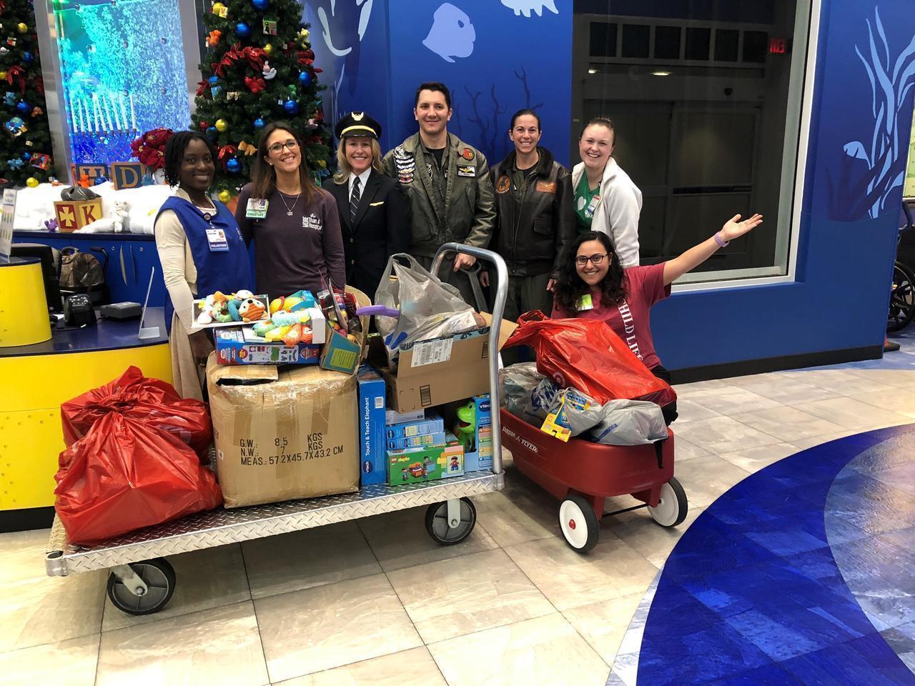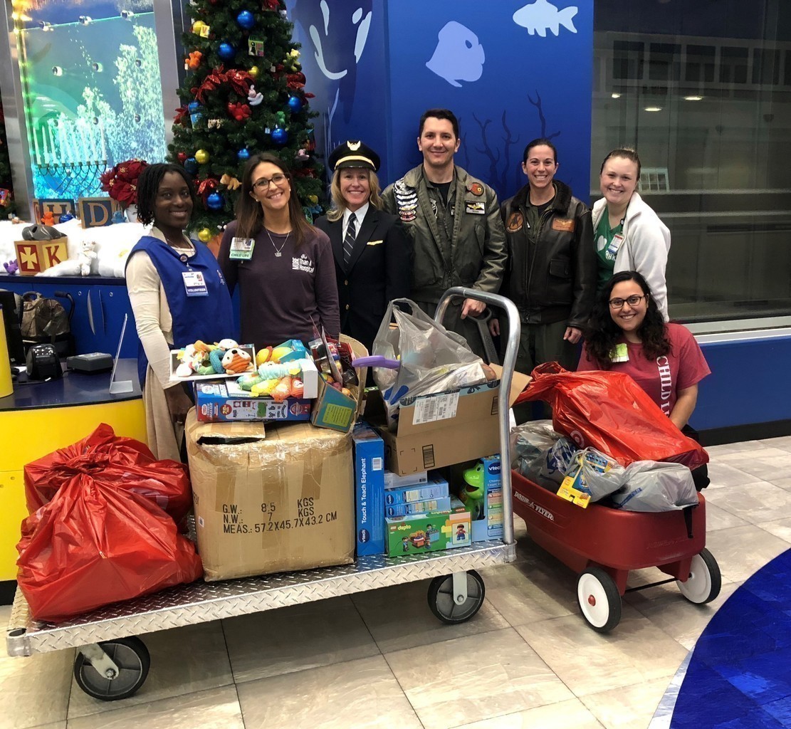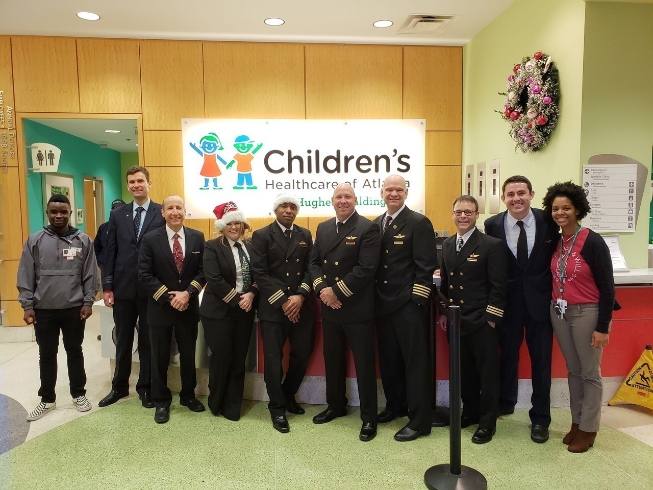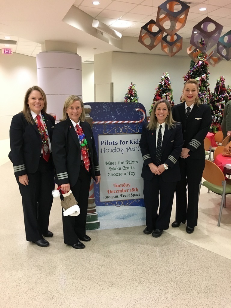 Description: On December 20th, 7 Pilots from Delta, United, Trans States and Jet Blue visited Hughes Spalding to spread holiday cheer.