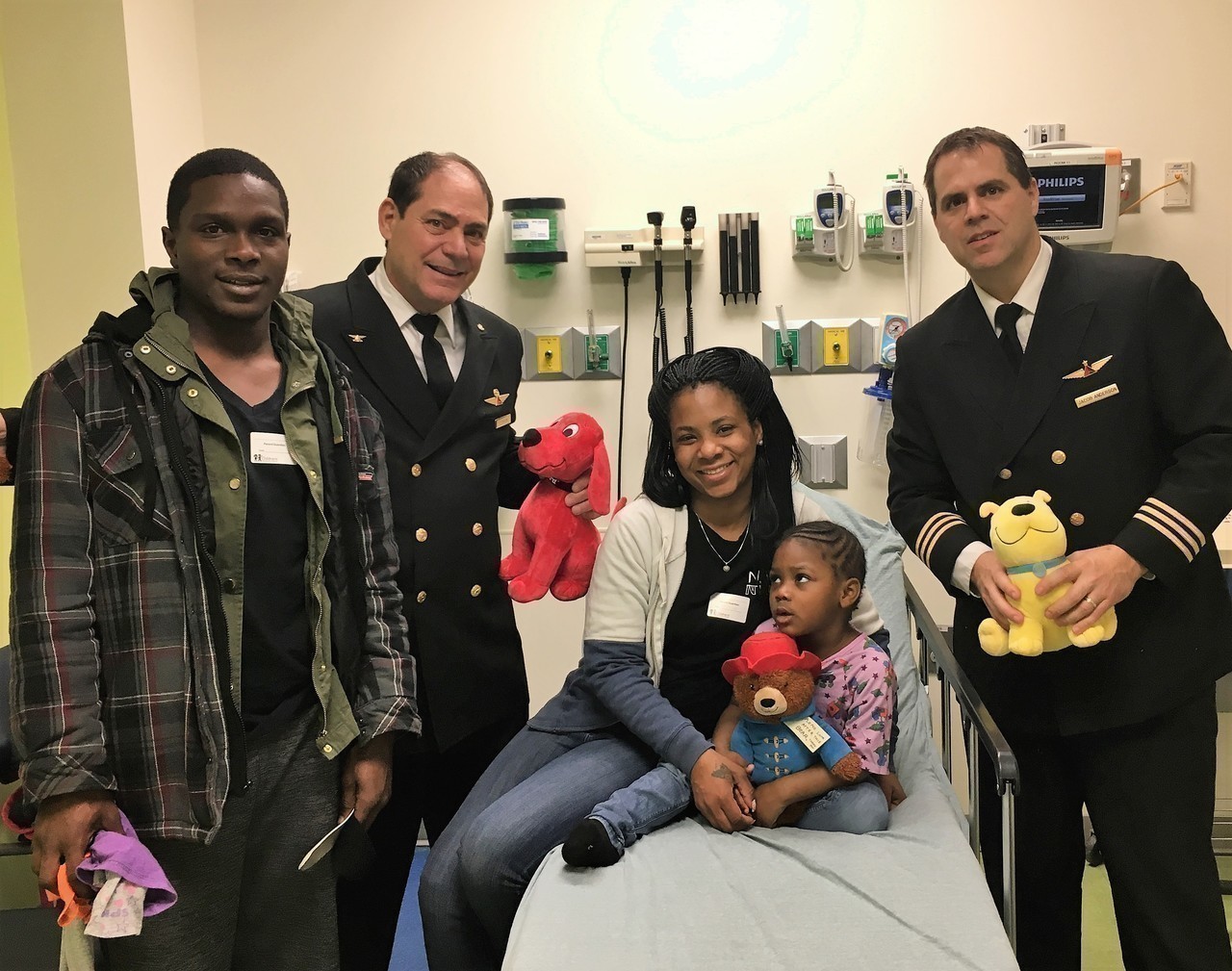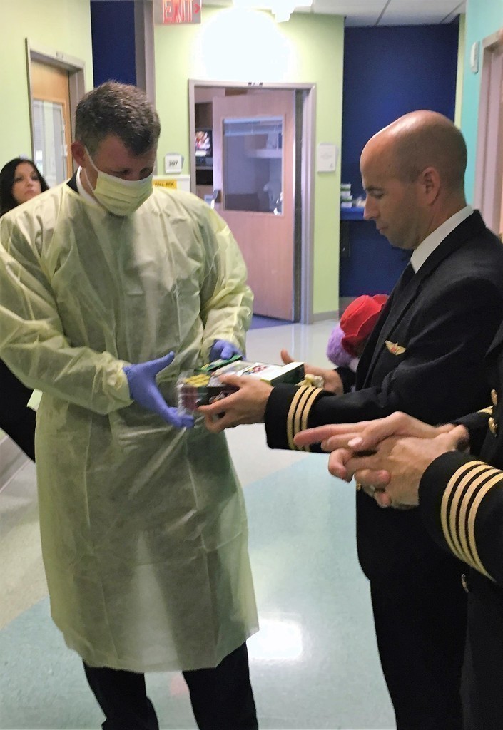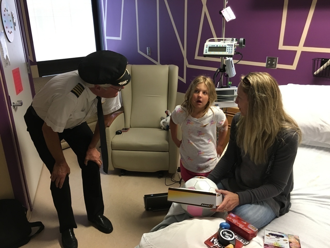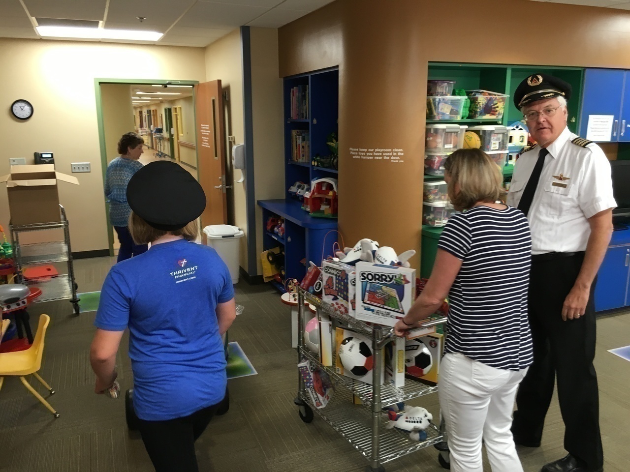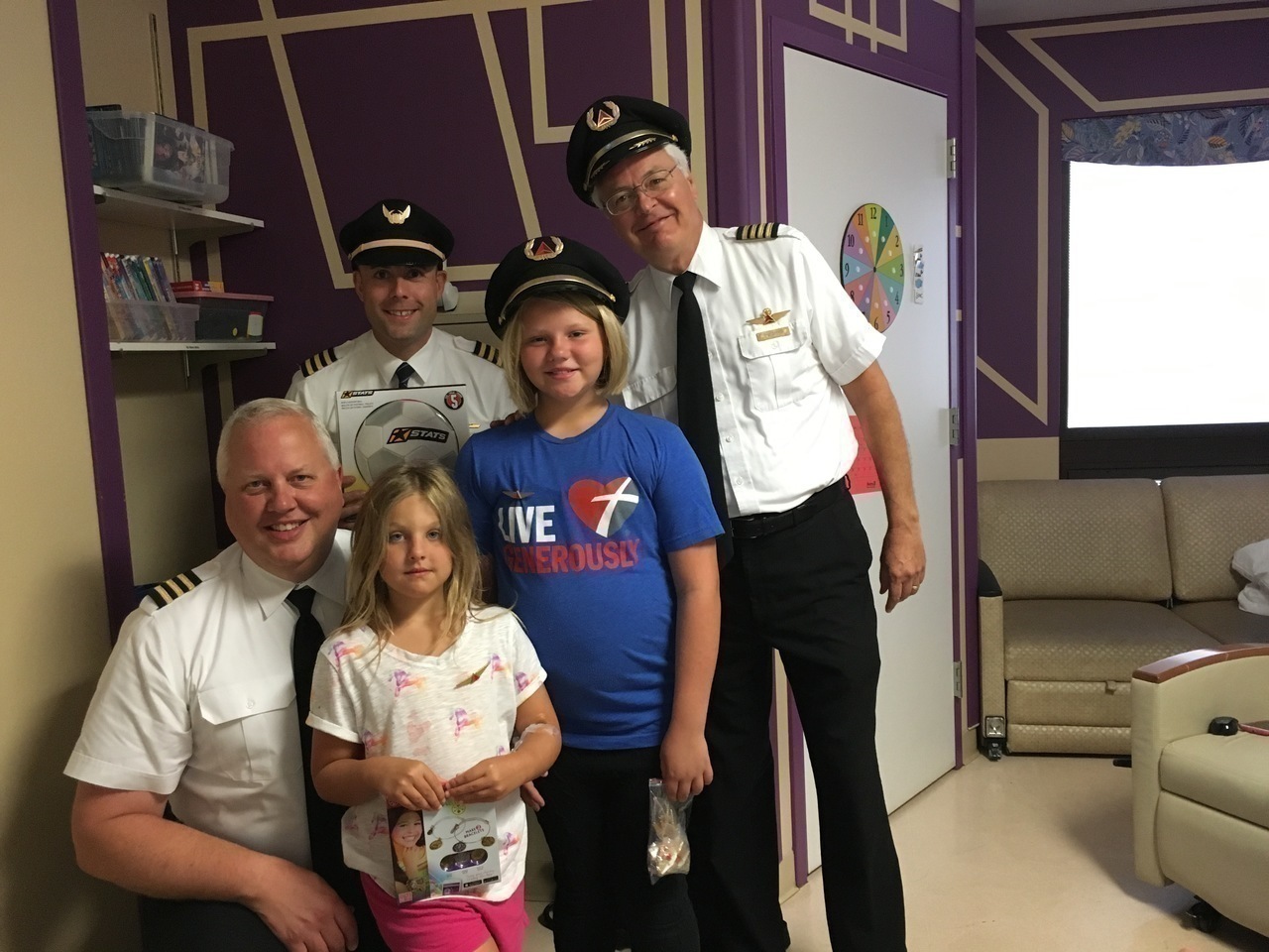 Description: Christmas In July for kids at Avera McKennan Hospital in Sioux Falls Breaking a bit from tradition, several pilots from FSD decided to bring a little “Christmas in July” for kids hospitalized at Avera McKennan Hospital and University Health Center in July last year (2016) instead of December. Among those pilots volunteering their time were Chris Rossing and Paul Dokken of Delta Air Lines and Casey Delany from United Airlines. Chris Rossing’s daughter Annabelle also lent a hand by helping to hand out toys and games to some of the children and their families at Avera. All-in-all it was a very fun and rewarding day to help bring a smile to kids needing one.