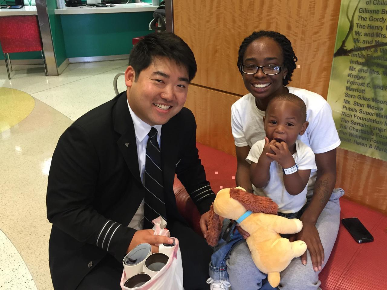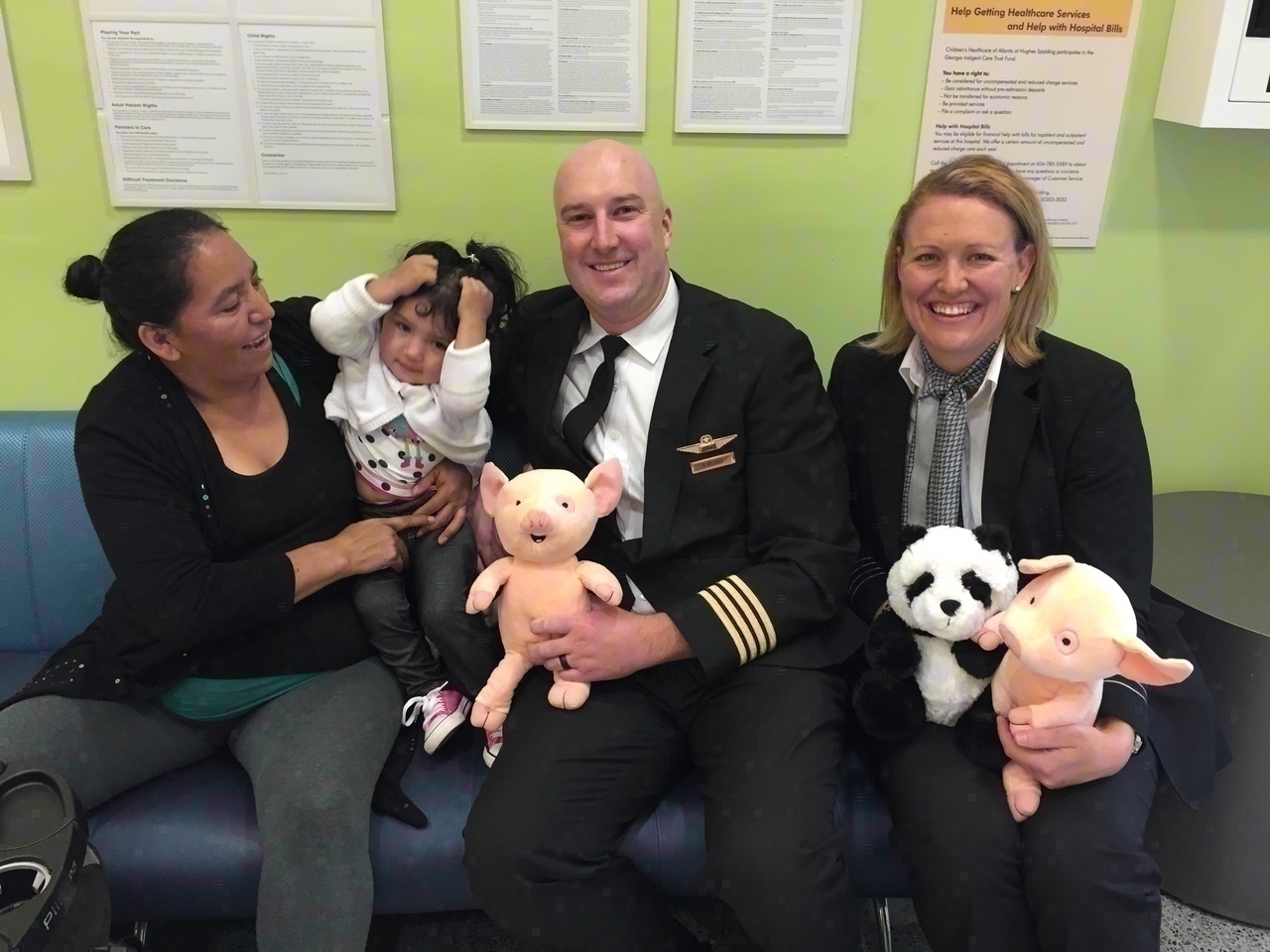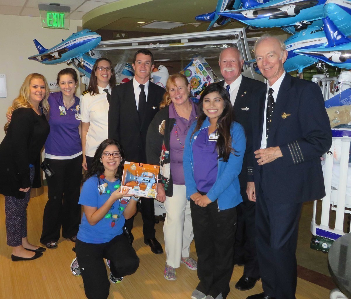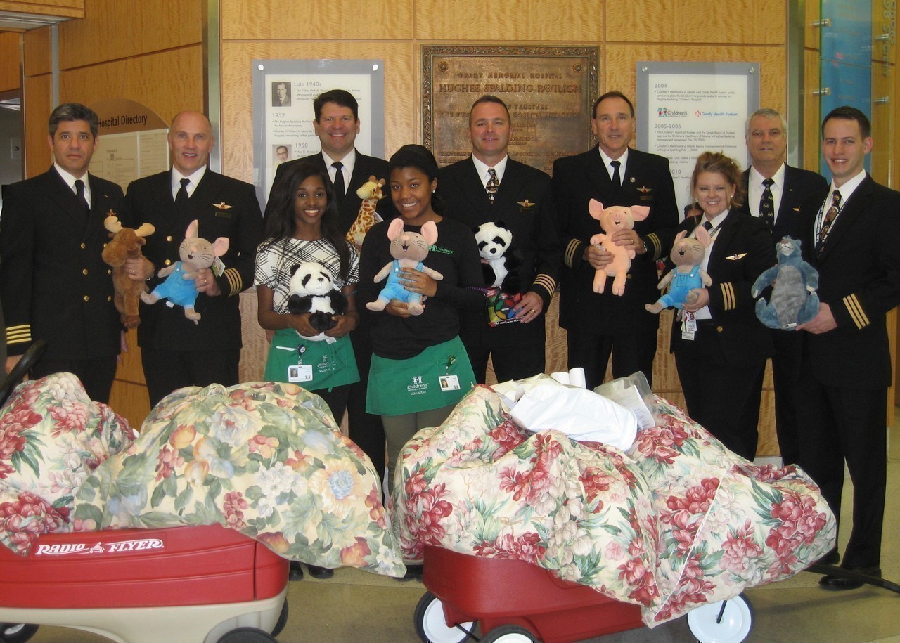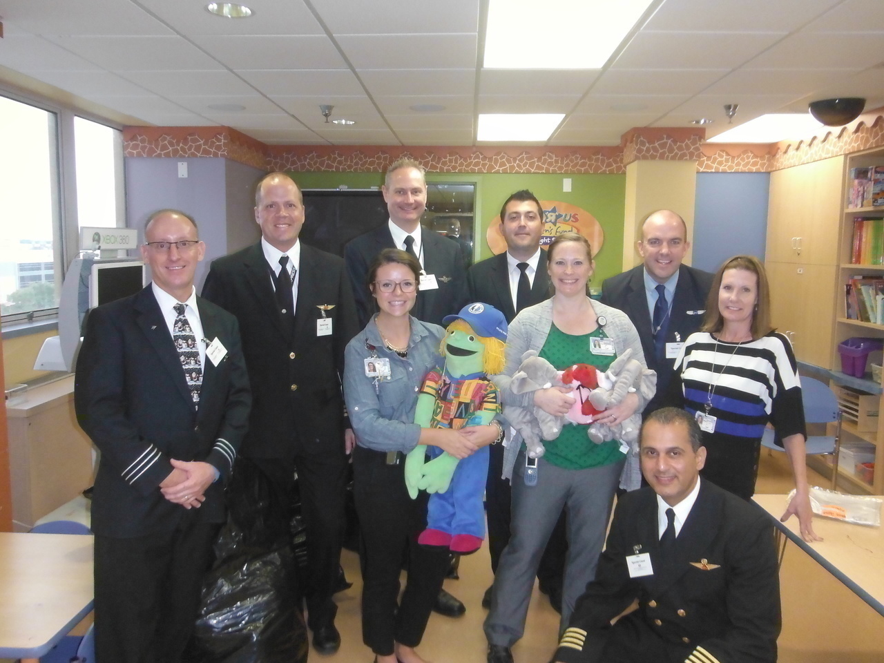 Description: 6 October 2015 visit. Front Row: Hamidah Ali (Hosp. Volunteer), Ryan Meloney (Endeavor), Brooks Broeckelman (ExpressJet), Mike Gofman (Frontier), Jon Roth (ExpressJet), Pam Barber (PSA), Nicole Woods (Hosp. Volunteer). Rear Row: Don Myers (Delta), Johnny McGee (NetJets), Greg Badgett (Delta), Chip Pinyan (Shuttle America), Hannah Peavy (ExpressJet), and Angie Millar (Delta). *** /// *** Mom and daughter, Evelyn, during 6 Oct 2015 visit with Ryan Meloney (ExpressJet) and Pam Barber (PSA). *** /// *** 19 November 2015 visit, before the wagons were depleted. Front Row: Hospital volunteers (and future healthcare workers) Rolla-Marie Wilson and Logan Dean. Rear Row: Doug Israelite (Delta), AJ Pope (Delta), JR Canales (Delta), Kevin Hines (Delta), Don Myers (Delta), Hannah Peavy (ExpressJet), Johnny McGee (NetJets), and Steve Taglia (ExpressJet).
