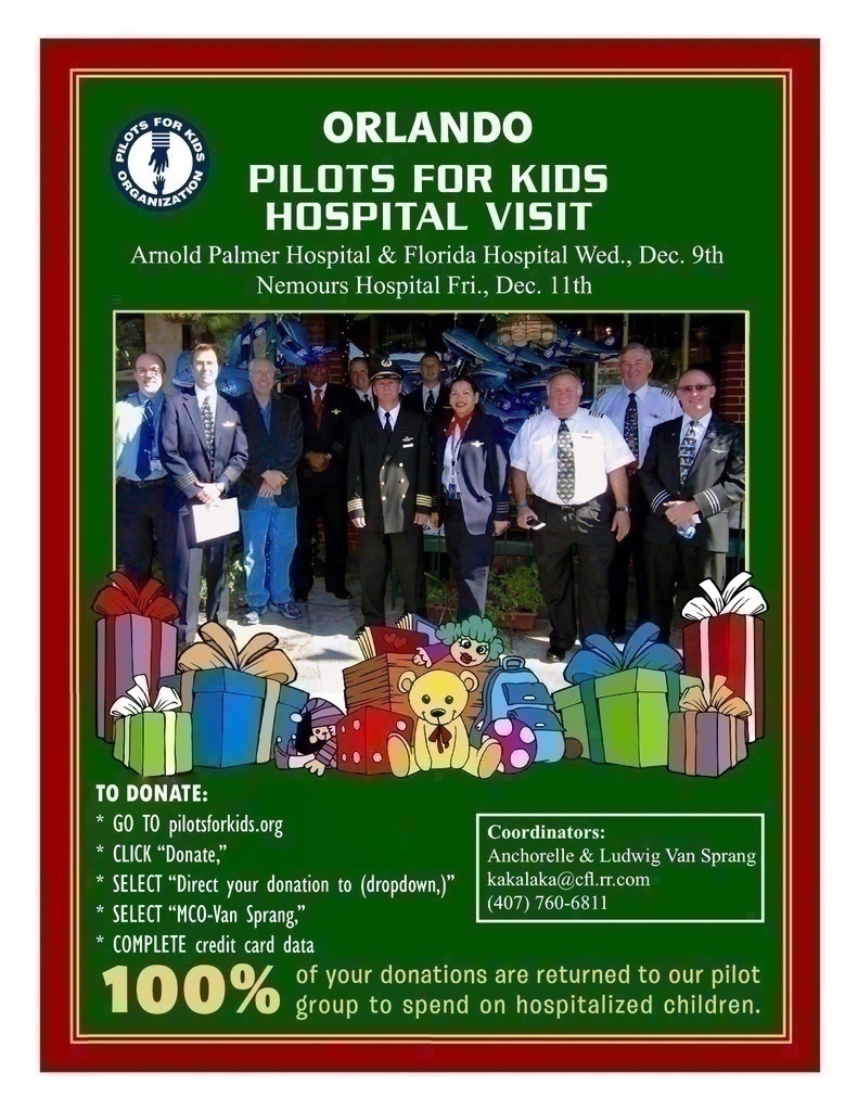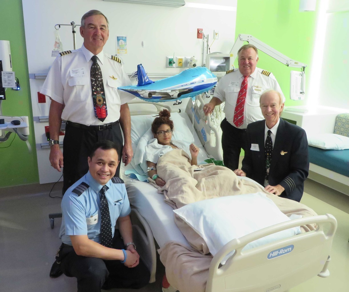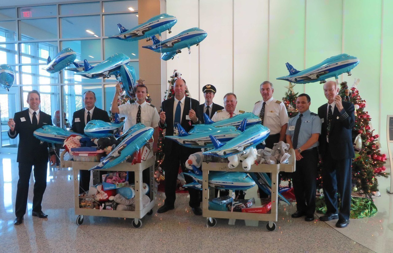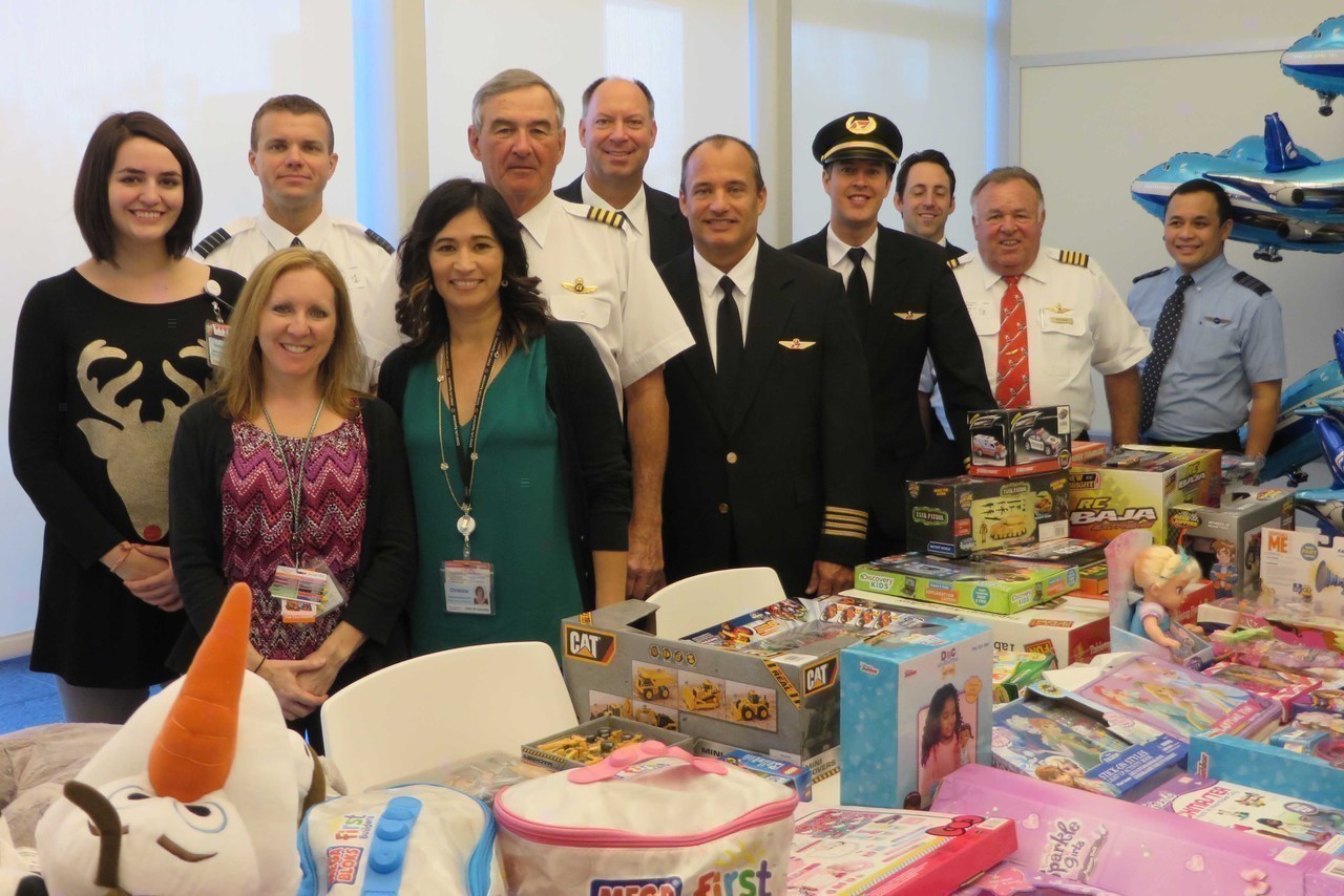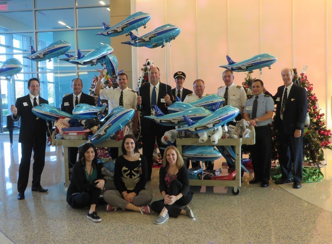 Description: 6 October 2015 visit. Front Row: Hamidah Ali (Hosp. Volunteer), Ryan Meloney (Endeavor), Brooks Broeckelman (ExpressJet), Mike Gofman (Frontier), Jon Roth (ExpressJet), Pam Barber (PSA), Nicole Woods (Hosp. Volunteer). Rear Row: Don Myers (Delta), Johnny McGee (NetJets), Greg Badgett (Delta), Chip Pinyan (Shuttle America), Hannah Peavy (ExpressJet), and Angie Millar (Delta). *** /// *** Mom and daughter, Evelyn, during 6 Oct 2015 visit with Ryan Meloney (ExpressJet) and Pam Barber (PSA). *** /// *** 19 November 2015 visit, before the wagons were depleted. Front Row: Hospital volunteers (and future healthcare workers) Rolla-Marie Wilson and Logan Dean. Rear Row: Doug Israelite (Delta), AJ Pope (Delta), JR Canales (Delta), Kevin Hines (Delta), Don Myers (Delta), Hannah Peavy (ExpressJet), Johnny McGee (NetJets), and Steve Taglia (ExpressJet).