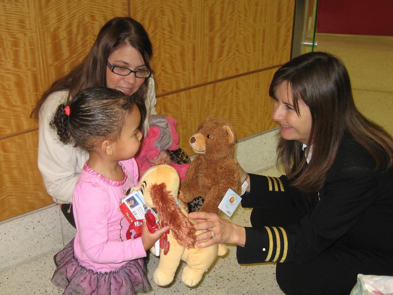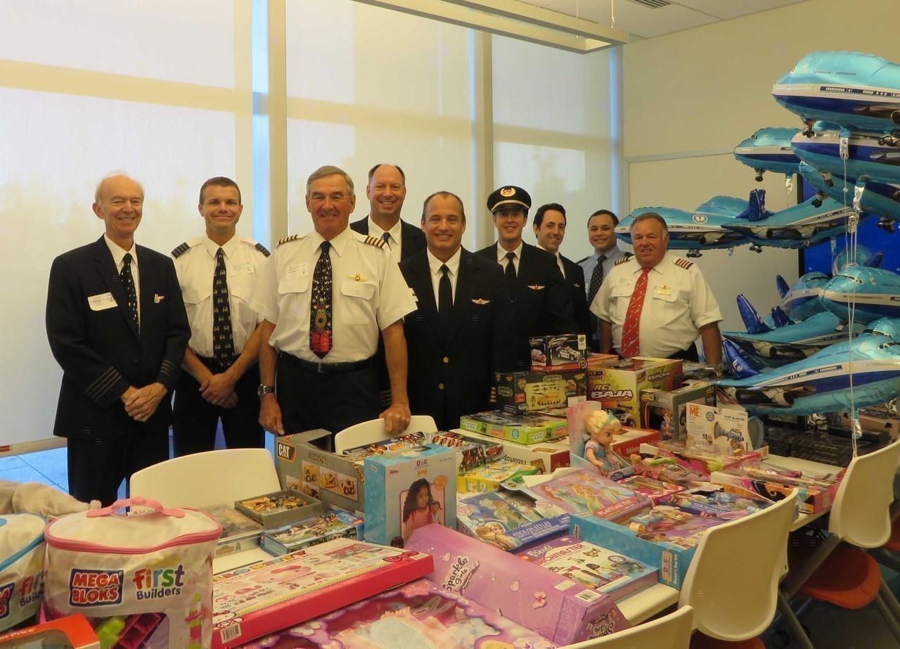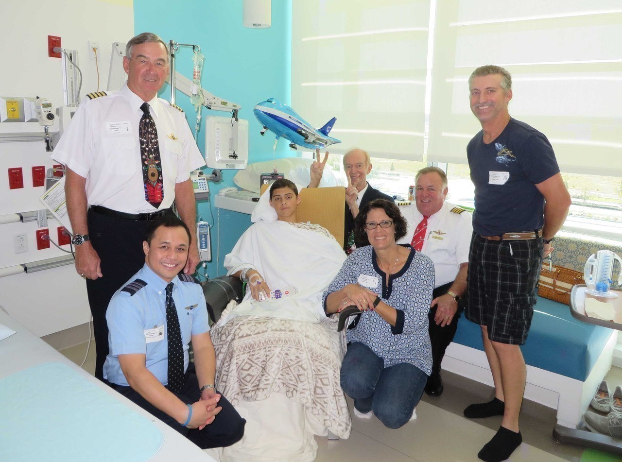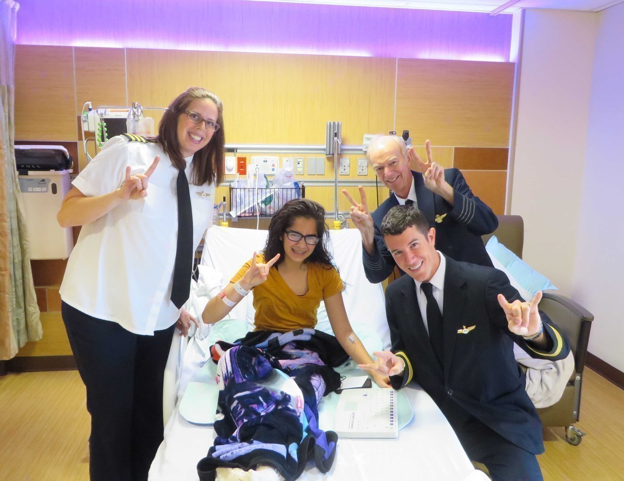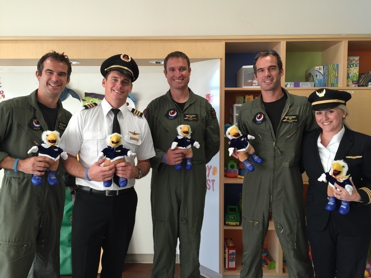 Description: 6 October 2015 visit. Front Row: Hamidah Ali (Hosp. Volunteer), Ryan Meloney (Endeavor), Brooks Broeckelman (ExpressJet), Mike Gofman (Frontier), Jon Roth (ExpressJet), Pam Barber (PSA), Nicole Woods (Hosp. Volunteer). Rear Row: Don Myers (Delta), Johnny McGee (NetJets), Greg Badgett (Delta), Chip Pinyan (Shuttle America), Hannah Peavy (ExpressJet), and Angie Millar (Delta). *** /// *** Mom and daughter, Evelyn, during 6 Oct 2015 visit with Ryan Meloney (ExpressJet) and Pam Barber (PSA). *** /// *** 19 November 2015 visit, before the wagons were depleted. Front Row: Hospital volunteers (and future healthcare workers) Rolla-Marie Wilson and Logan Dean. Rear Row: Doug Israelite (Delta), AJ Pope (Delta), JR Canales (Delta), Kevin Hines (Delta), Don Myers (Delta), Hannah Peavy (ExpressJet), Johnny McGee (NetJets), and Steve Taglia (ExpressJet).
