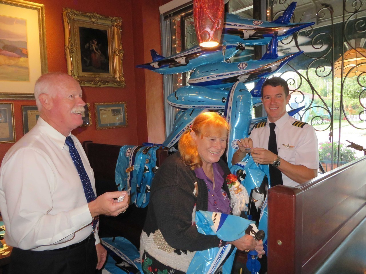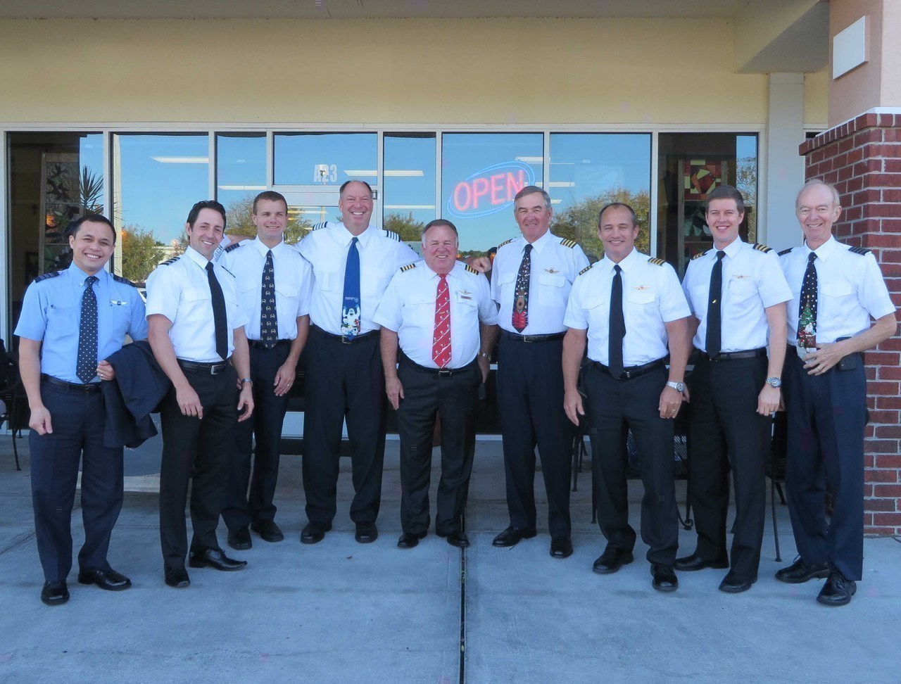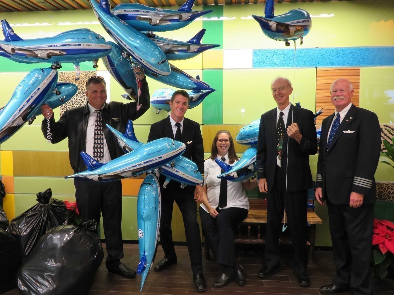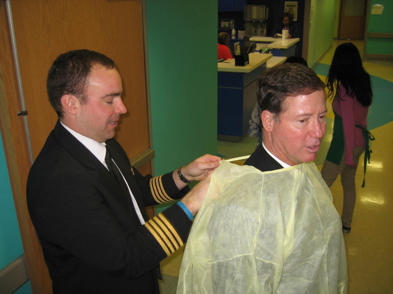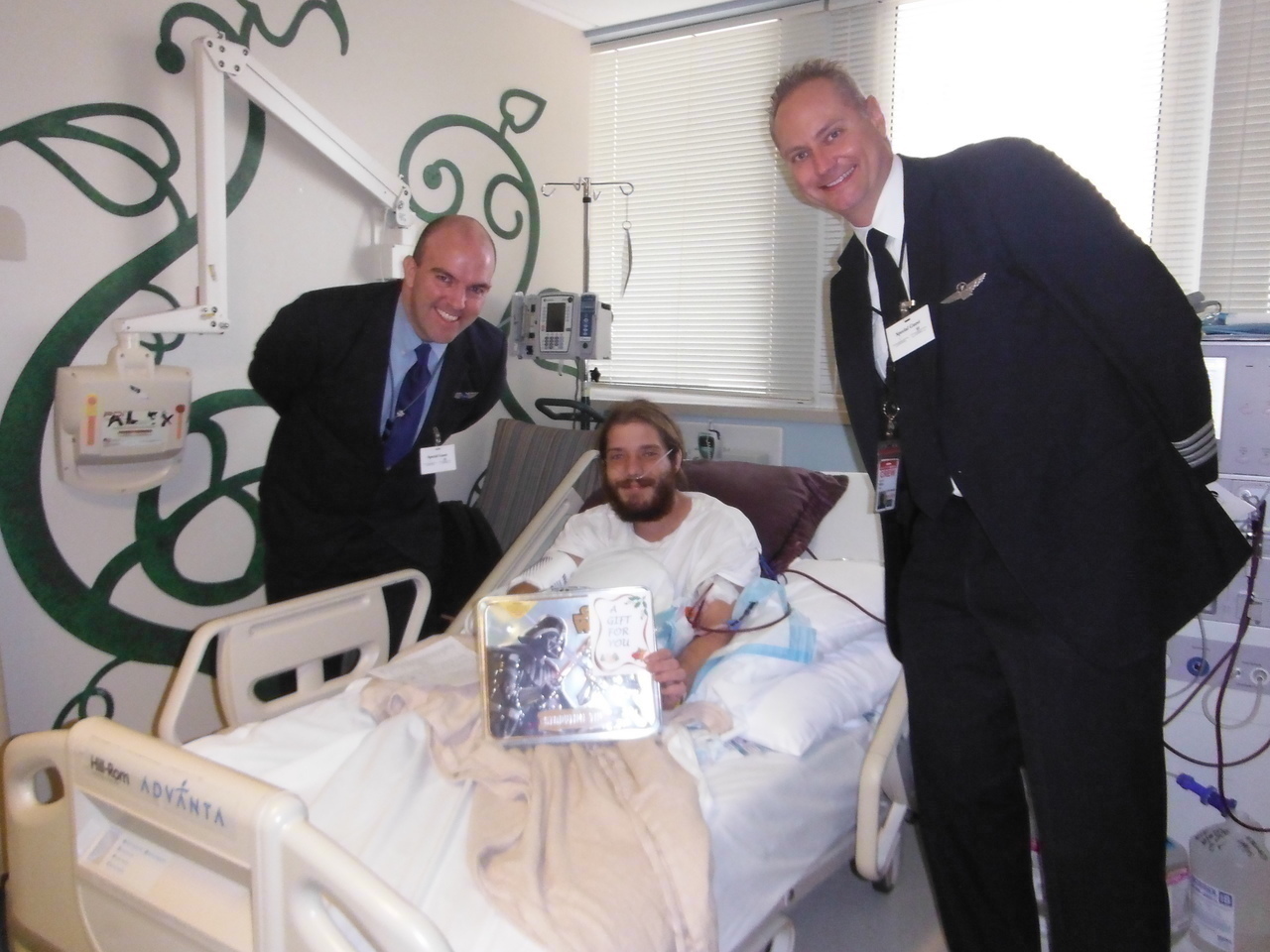 Description: 6 October 2015 visit. Front Row: Hamidah Ali (Hosp. Volunteer), Ryan Meloney (Endeavor), Brooks Broeckelman (ExpressJet), Mike Gofman (Frontier), Jon Roth (ExpressJet), Pam Barber (PSA), Nicole Woods (Hosp. Volunteer). Rear Row: Don Myers (Delta), Johnny McGee (NetJets), Greg Badgett (Delta), Chip Pinyan (Shuttle America), Hannah Peavy (ExpressJet), and Angie Millar (Delta). *** /// *** Mom and daughter, Evelyn, during 6 Oct 2015 visit with Ryan Meloney (ExpressJet) and Pam Barber (PSA). *** /// *** 19 November 2015 visit, before the wagons were depleted. Front Row: Hospital volunteers (and future healthcare workers) Rolla-Marie Wilson and Logan Dean. Rear Row: Doug Israelite (Delta), AJ Pope (Delta), JR Canales (Delta), Kevin Hines (Delta), Don Myers (Delta), Hannah Peavy (ExpressJet), Johnny McGee (NetJets), and Steve Taglia (ExpressJet).