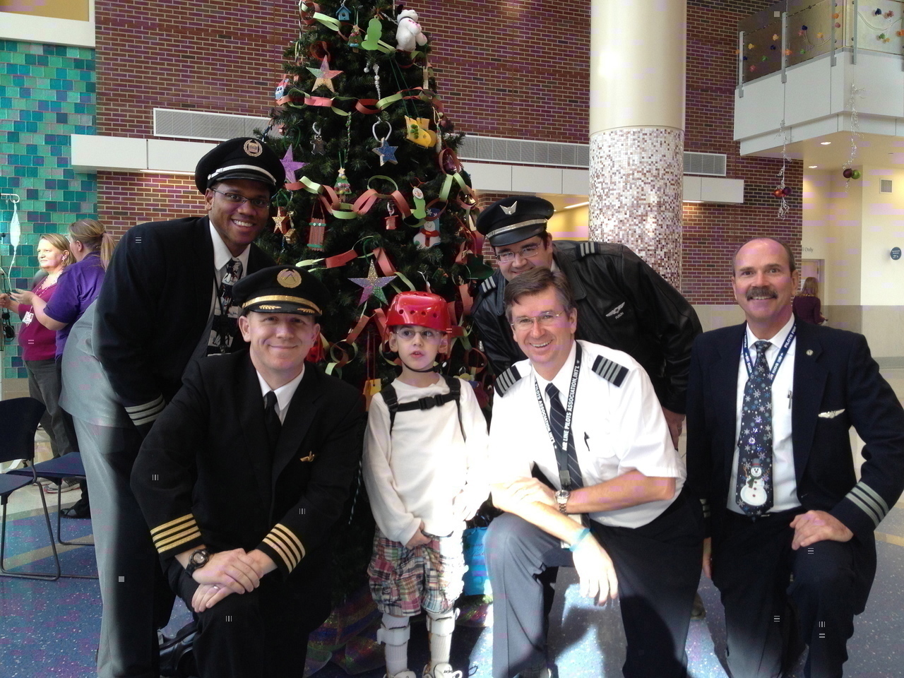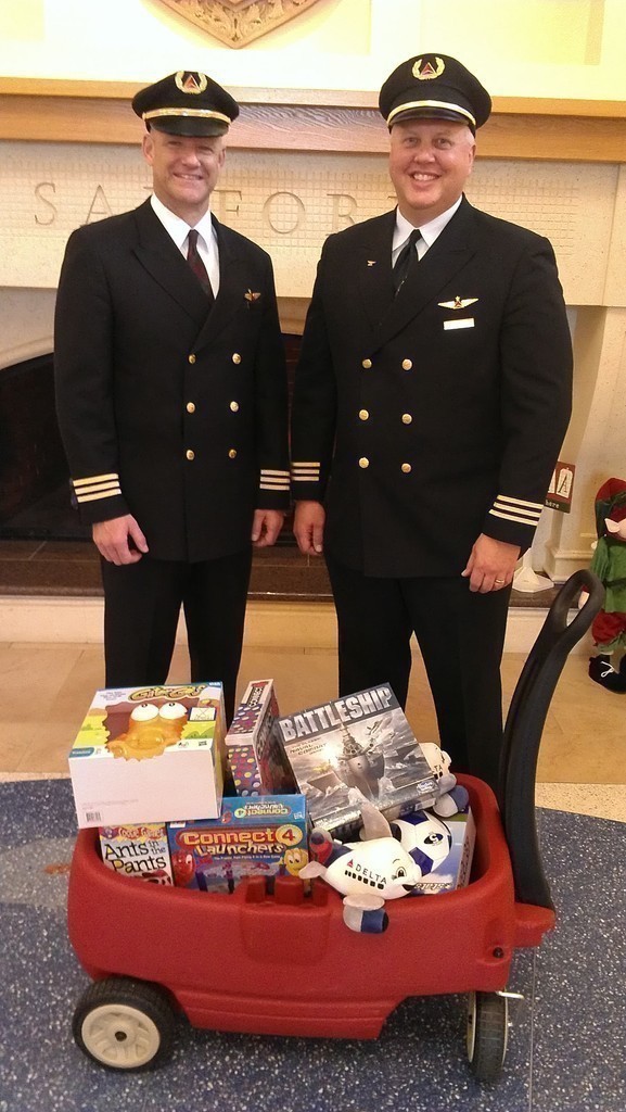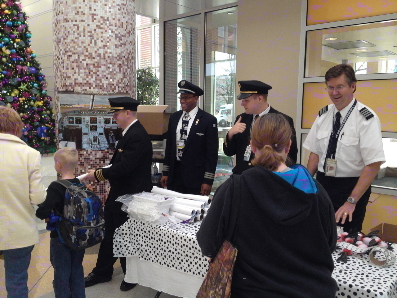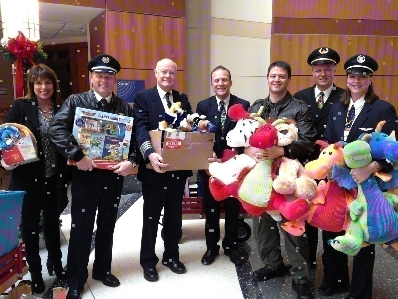 Description: Delta pilots Chris Rossing and Mike Meyers distribute toys to sick kids at Sanford Children's Hospital just in time for the holidays in mid December 2013.