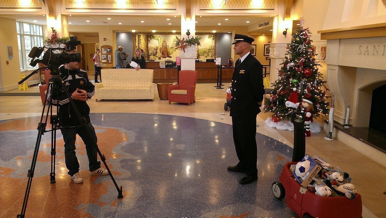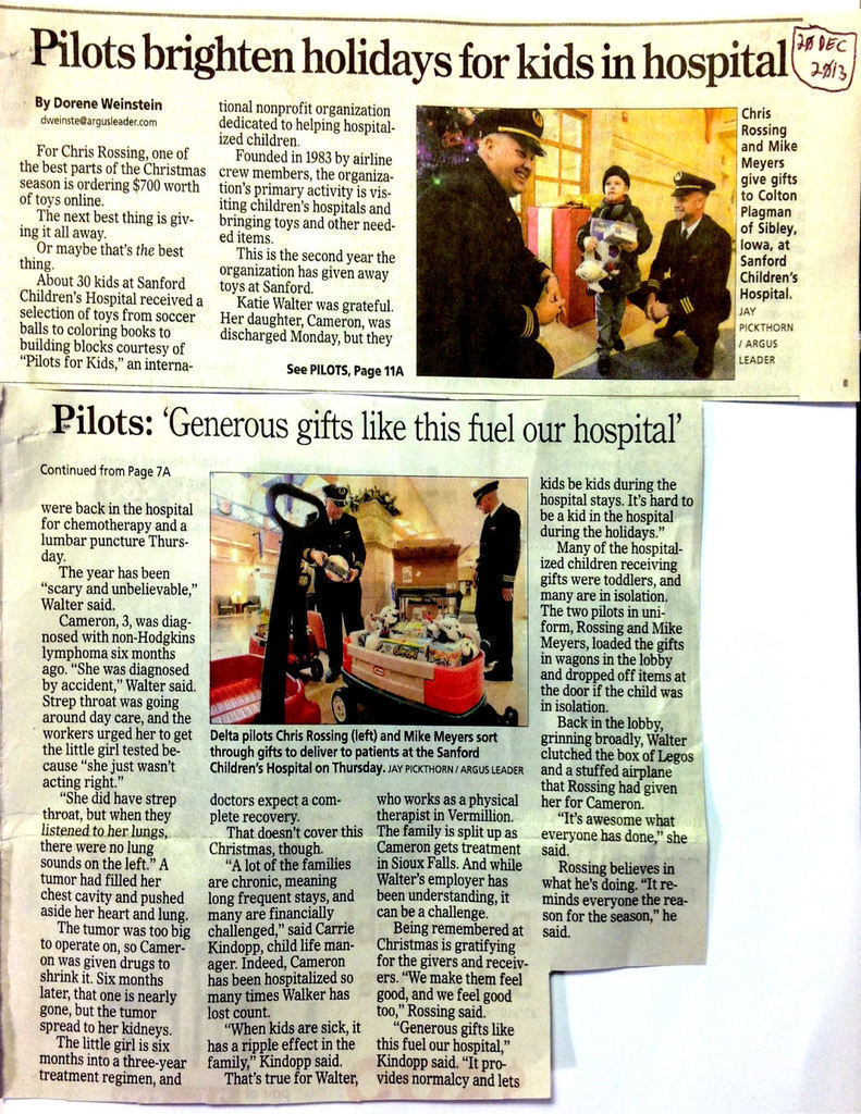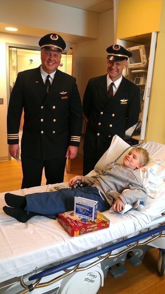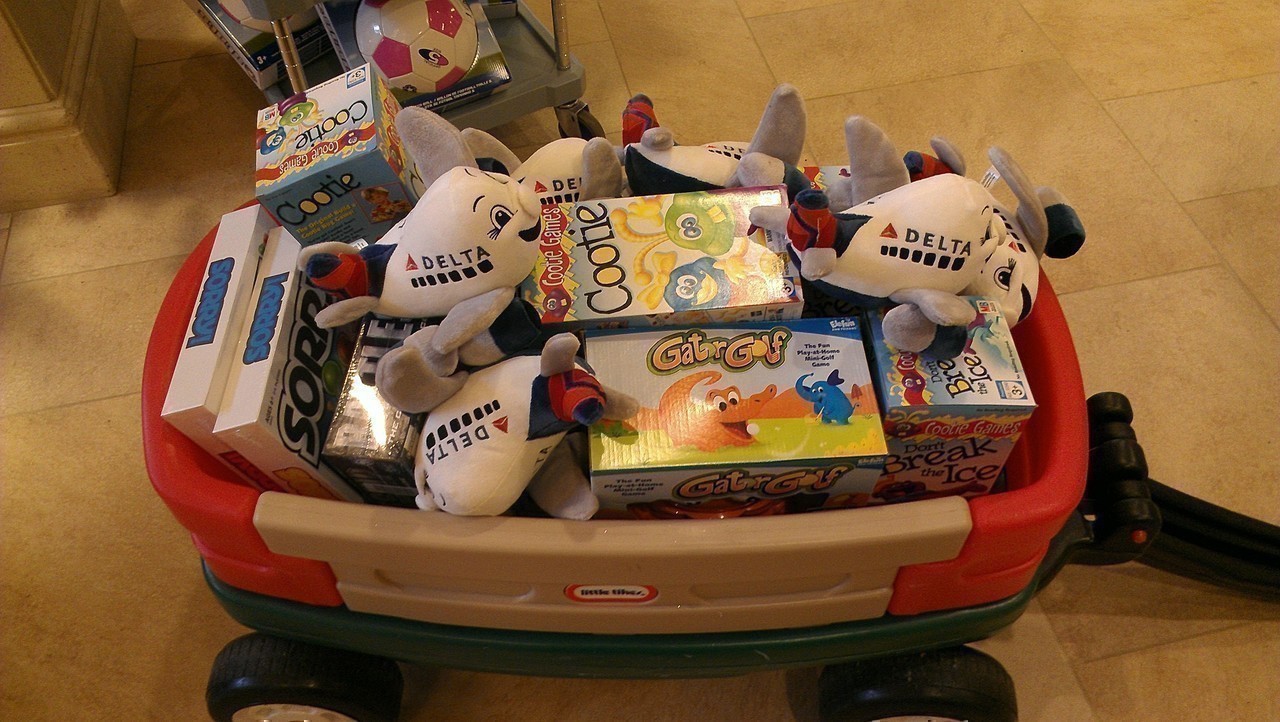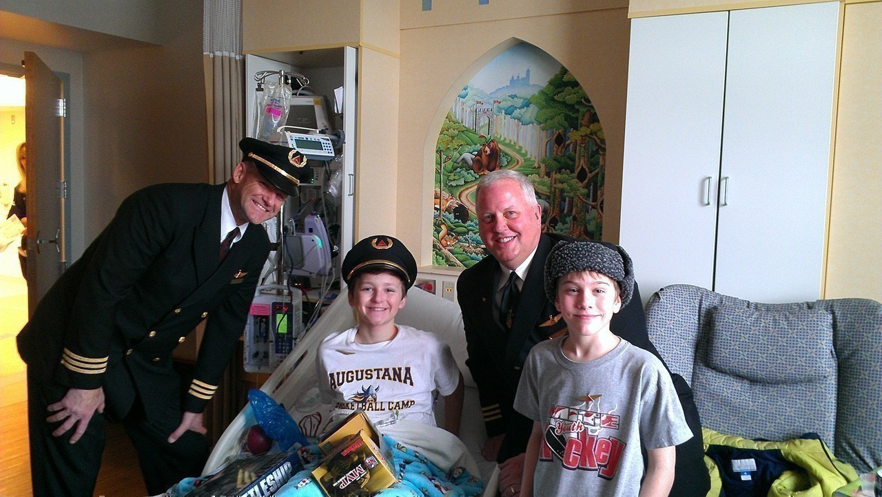 Description: Delta pilots Chris Rossing and Mike Meyers distribute toys to sick kids at Sanford Children's Hospital just in time for the holidays in mid December 2013.