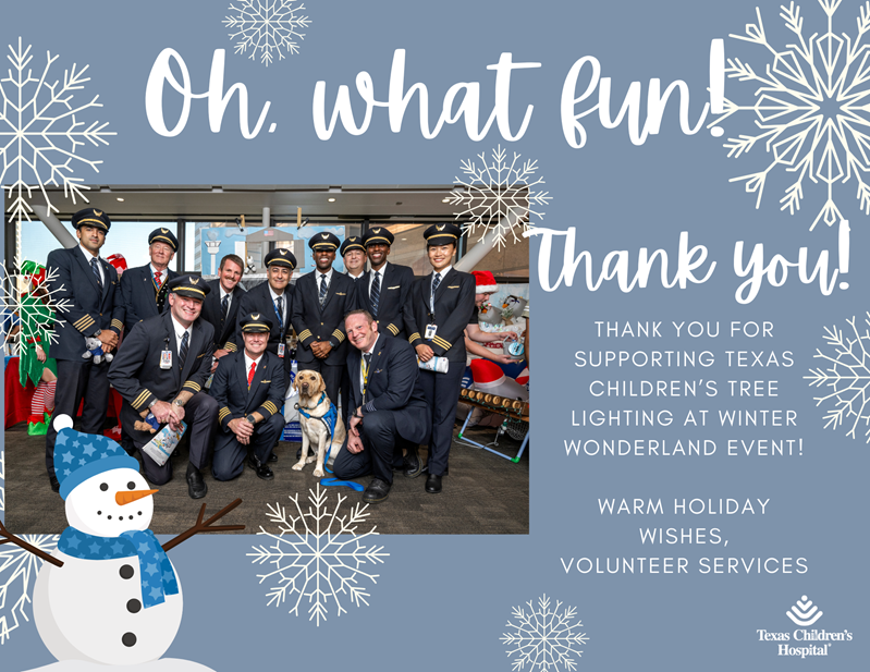 Description: The Houston Pilots for Kids visited the Texas Children's Hospital Downtown Houston Campus December 3, 2024. We had great activities for the kids and distributed a wide variety of gifts and smiles at the Texas Children's Tree Lighting Ceremony!