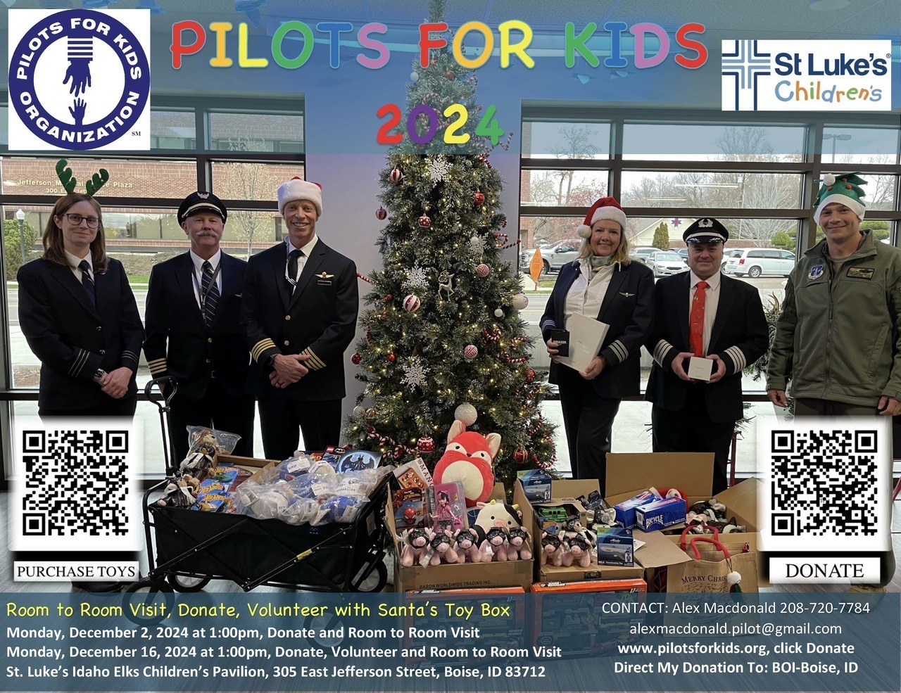 Description: The Houston Pilots for Kids group visited Children's Memorial Hermann Hospital in downtown Houston on December 2, 2024. Pilots were able to visit kids in the rooms on various floors and distribute gifts and smiles. This was a great event that was well attended and received!